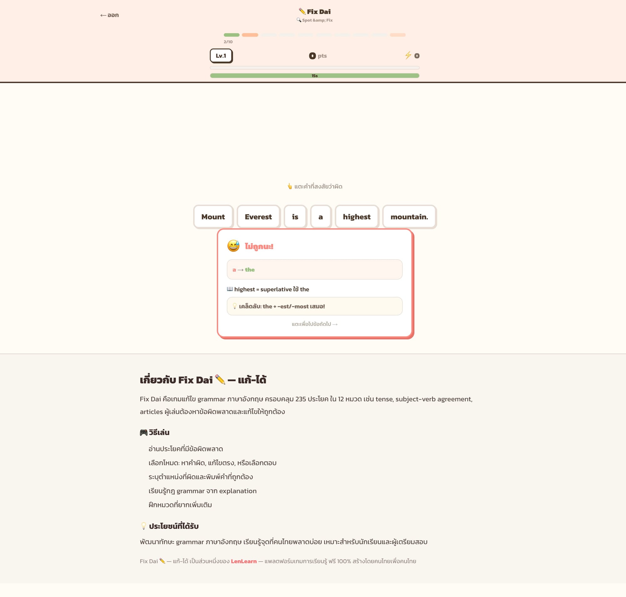 เกมแก้ไขแกรมม่าร์ภาษาอังกฤษ 235 ประโยค 12 หมวดไวยากรณ์ 3 โหมดการเล่น ฝึกจับผิดและแก้ไขข้อผิดพลาดทางไวยากรณ์ที่คนไทยมักทำผิด
