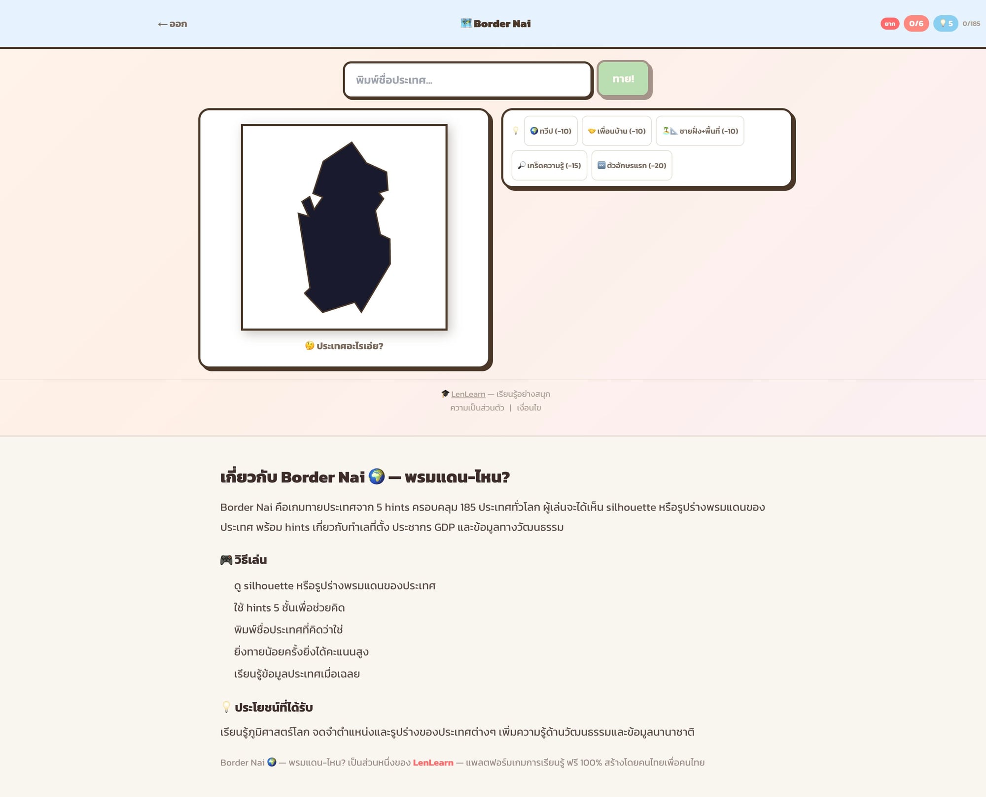 เล่น Border Nai เกมทายประเทศจากรูปร่างแผนที่ 185 ประเทศ พร้อมระบบ 5 คำใบ้ เรียนรู้ภูมิศาสตร์โลกอย่างสนุกและจำง่าย