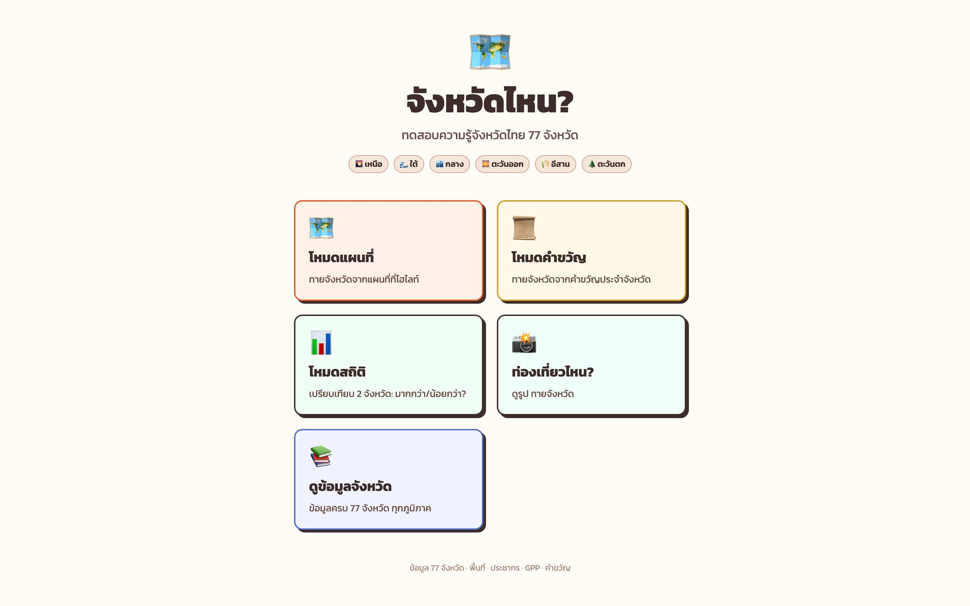 Province Nai เกมทายจังหวัดไทยทั้ง 77 จังหวัดจากคำใบ้ สถานที่ อาหาร วัฒนธรรม เรียนรู้ภูมิศาสตร์และท้องถิ่นไทยอย่างสนุก