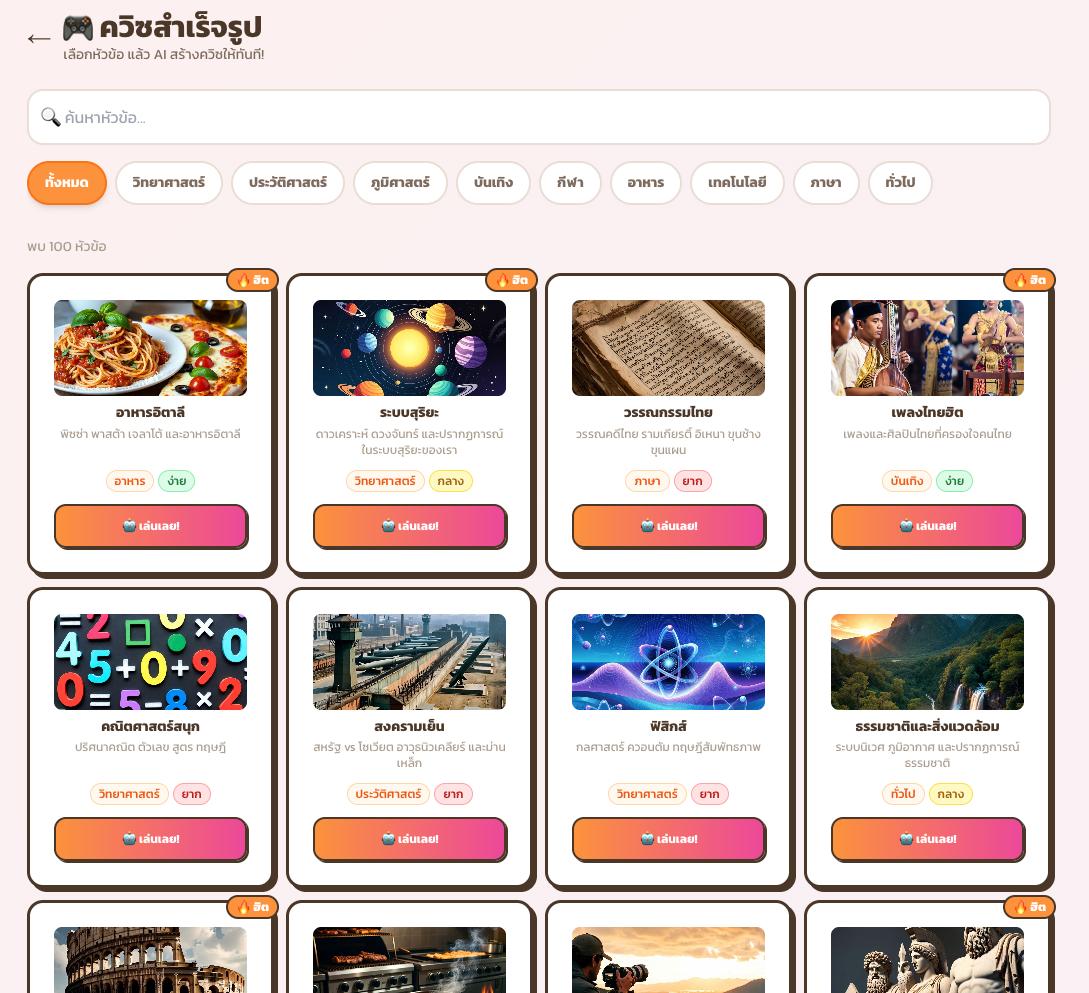 เกมควิซที่ใช้ AI สร้างคำถามจากทุกหัวข้อ เล่นแบบ Kahoot-style ทั้งเดี่ยวและหลายคน เหมาะสำหรับครู นักเรียน และทุกคนที่อยากเรียนรู้ผ่านการเล่นเกม
