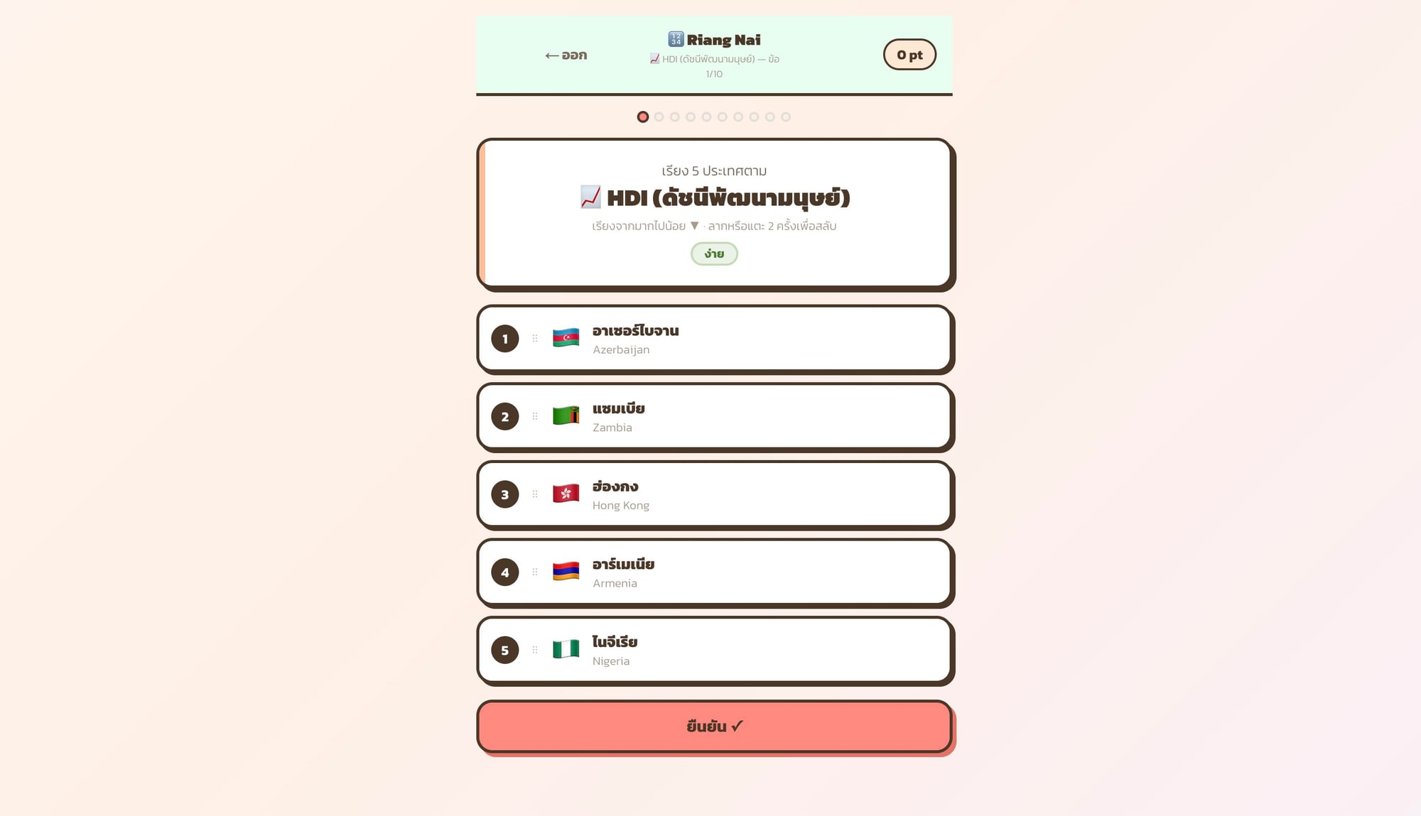 เกมเรียงลำดับประเทศตามข้อมูลสถิติจริง ทั้งประชากร พื้นที่ GDP และอื่น ๆ ครอบคลุม 120 ประเทศ ฝึกความรู้ภูมิศาสตร์เชิงเปรียบเทียบผ่านการเล่นเกม