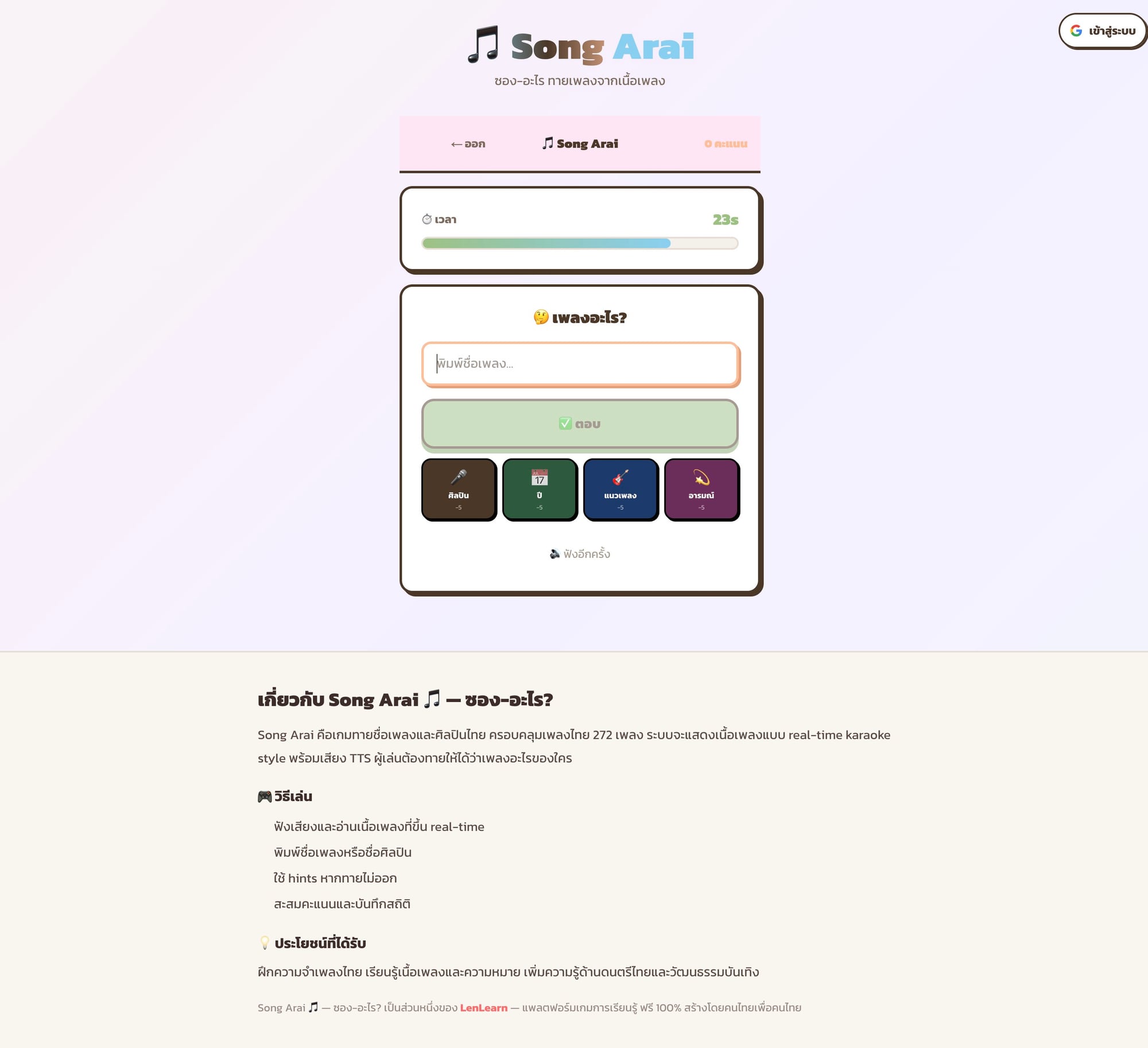 เล่น Song Arai เกมทายเพลงไทยจากเนื้อเพลงแบบ Real-time LRC กับฐานข้อมูล 1,069 เพลง ฝึกความจำและสนุกไปกับเพลงไทยทุกยุค