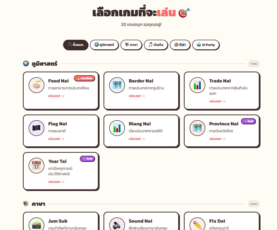 รวม 19 เกม quiz ออนไลน์ฟรีบน LenLearn เล่นได้เลยไม่ต้องดาวน์โหลด ครอบคลุมภูมิศาสตร์ ภาษา กีฬา อาหาร และ AI Party เหมาะสำหรับทุกวัย 2026